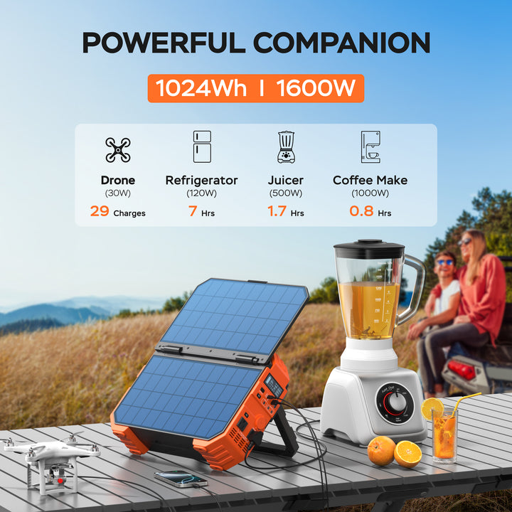 [High-Capacity Power Supply]: 1024Wh capacity + 1600W pure sine wave inverter (3200W surge), powers up to 7 devices simultaneously, including laptops, CPAP machines, and mini-fridges.